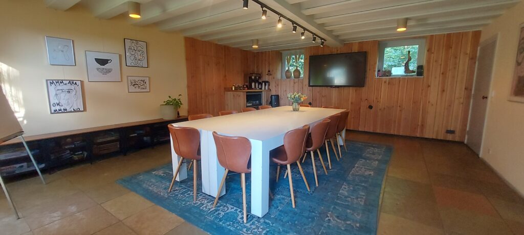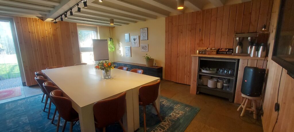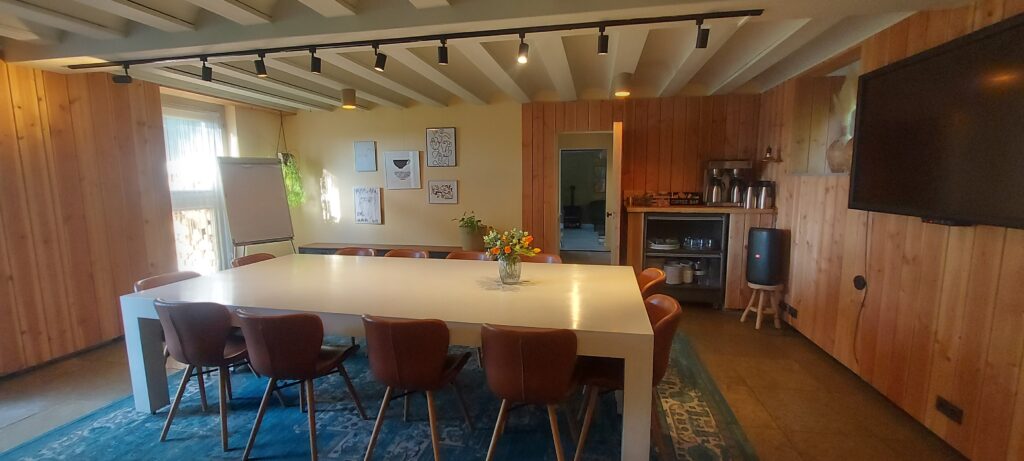 Te midden van natuur, rust en ruimte kunt u hier zowel binnen als buiten gebruik maken van diverse faciliteiten. Onze locatie beschikt over een groot (touchscreen) beeldscherm, voldoende gratis parkeerplekken en kan naar wens worden verzorgd met een heerlijke lunch , ‘ bites en drinks’ en/ of een landelijke maaltijd. De ruimte is geschikt voor een groep van maximaal 12 personen. Tevens is er een extra break-out ruimte bij te huren voor het werken in groepjes. Vraag ons voor een vrijblijvende offerte.
